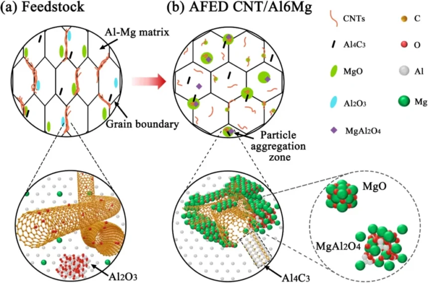 Analiza chemiczna wykazała, że ​​interakcje pomiędzy atomami magnezu i tlenem zaadsorbowanym na CNT utworzyły podczas AFED cząstki MgO i MgAl₂O₄. Te nanocząstki działały jak bariery dyfuzyjne, które ograniczały dalszą reakcję między fragmentami CNT a matrycą aluminiową, ograniczając tworzenie kruchych faz Al₄C₃ i poprawiając stabilność granicy faz. Połączenie rafinowanych ziaren i wzmocnienia w nanoskali spowodowało zaobserwowany 78-procentowy wzrost granicy plastyczności bez dodatkowej obróbki cieplnej.