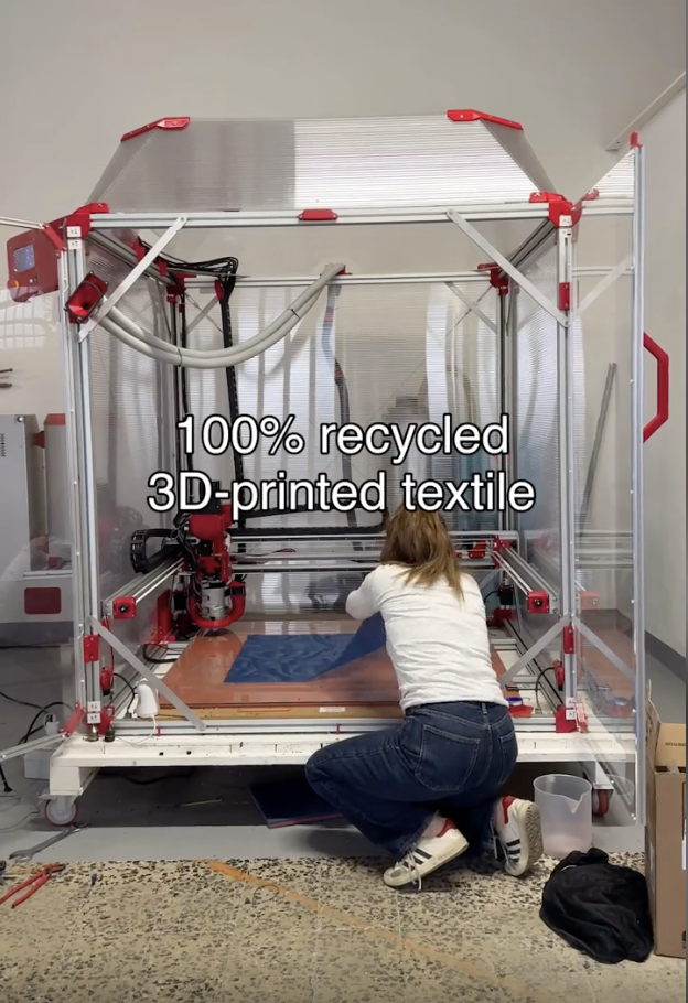 Projekt rozpoczyna się od resztek produkcyjnych pochodzących od włoskiego producenta Czysty Denim znanej z innowacji dżinsowych zorientowanych na zrównoważony rozwój. Odpady są rozdrabniane na włókna, mieszane z TPU pochodzącym w 100% z recyklingu i wytłaczane w granulki nadające się do wielkoformatowego wytwarzania przyrostowego. Korzystając z drukarki Ginger Additive, zespół Pelega wyprodukował próbkę tekstyliów o wymiarach 70 × 70 cm w niecałe 30 minut.