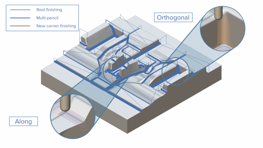 ModuleWorks 2025.12 dodaje ścieżkę narzędzia do wykańczania narożników, która wykrywa nieobcięty materiał, generuje stabilne linie środkowe narzędzi i łączy zoptymalizowane ścieżki, aby ograniczyć konieczność zmiany położenia. Ścieżka narzędzia dostosowuje strategie dla stromych i płytkich obszarów, aby zapewnić dokładne usuwanie materiału, spójne wykończenie powierzchni i mniej ręcznego polerowania.