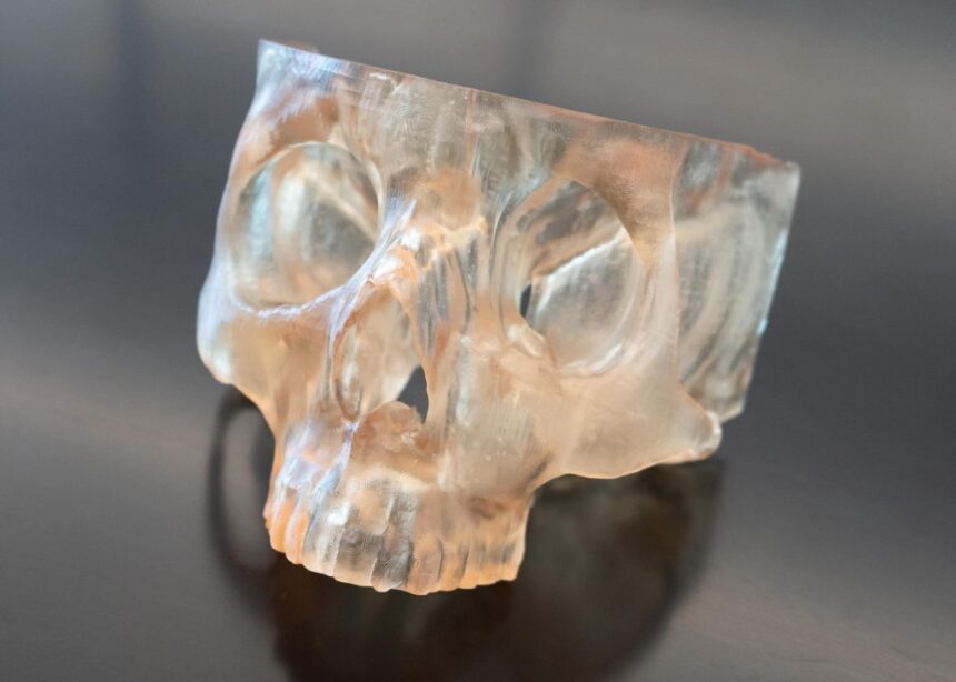 Powyższe zdjęcie przedstawia wydrukowany w 3D model czaszki pacjenta, wyprodukowany w laboratorium M4. Zdjęcie za pośrednictwem OSUCC – Arthur G. James Cancer Hospital/Richard J. Solove Research Institute